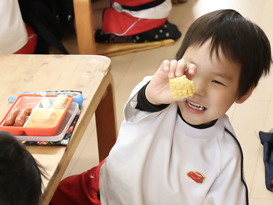 味付けや食材、お弁当箱の素材に気を配り、アレルギーのお子様にも対応できる給食センターからの給食を、皆でいただきます。お友だちと同じ献立を一緒に食べると、好き嫌いも自然になくなります。